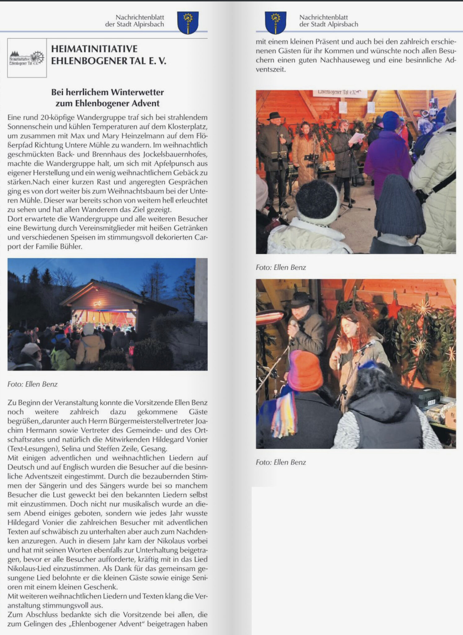 Als feste Veranstaltung im Alpirsbacher Veranstaltungskalender hat sich der Ehlenbogener Advent, verbunden mit einer geführten Wanderung vom Klosterplatz über den Flößerpfad mit kurzer Rast auf dem Jockelsbauernhof bis zum Weihnachtsbaum, bei der Unteren Mühle/Carport der Familie Bühler entwickelt. Bei der Wanderung nahmen jedes Mal ca. 20 Wanderer teil. Am festlich geschmückten Carport wurden weihnachtliche Lieder durch Steffen Zeile und Inge Späth (2023) bzw. Selina Zeile (2024) und mundartlich vorgetragene adventliche Texte von Hildegard Vonier vorgetragen, verbunden mit einer Bewirtung und dem Besuch des Nikolauses. Ein Dankeschön richtete Ellen Benz an alle Beteiligten sowie an die Familie Stortz, die jedes Jahr die Aufstellung des Weihnachtsbaums auf ihrem Grundstück möglich machte.